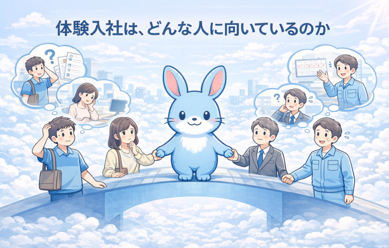 転職に不安を感じている人 転職は、人生の大きな決断です。 求人票や面接だけでは、本当の職場環境は見えてきません。 「また合わなかったらどうしよう」 「入ってみないと分からないのが怖い」 そう感じている人にこそ、体験入社は … 続きを読む 体験入社は、どんな人に向いているのか